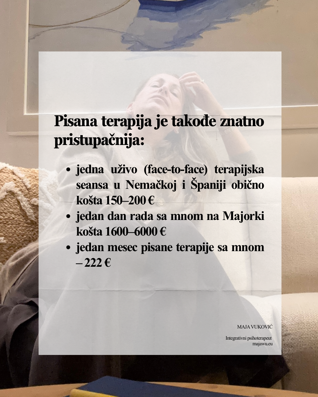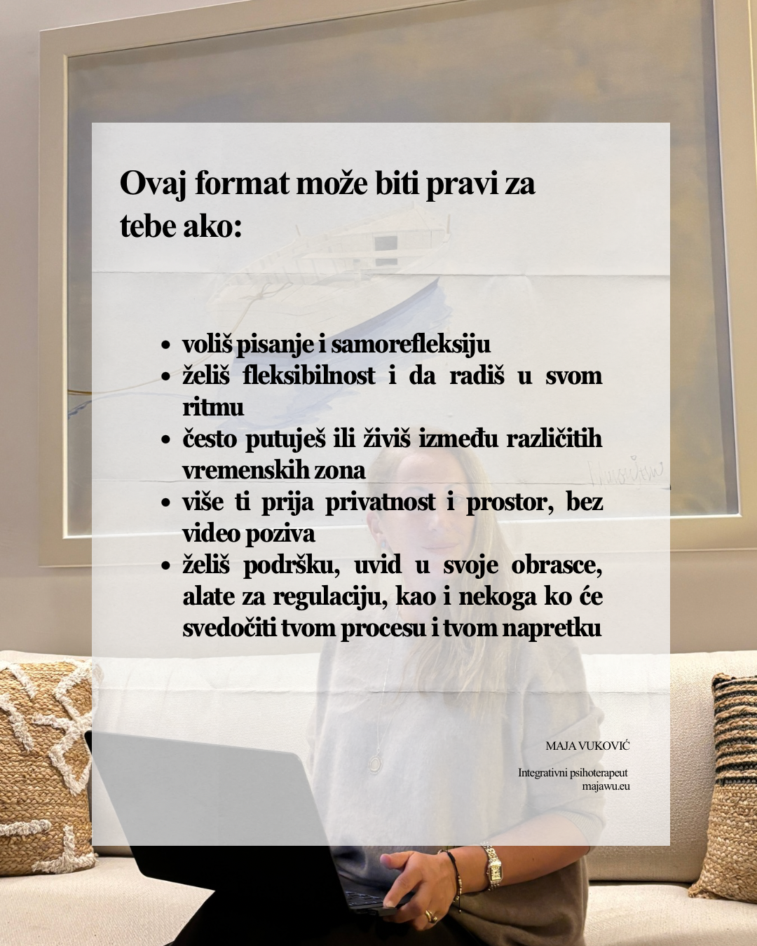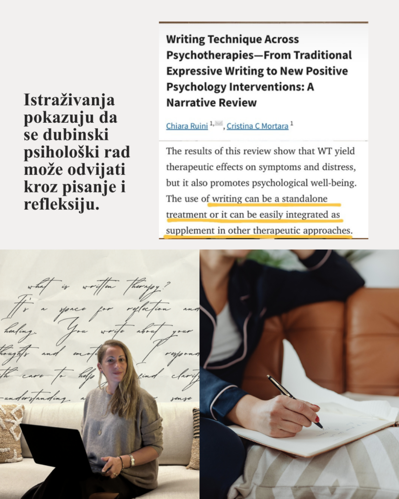 Namenjena je osobama koje se jasnije izražavaju u pisanju, koje žele dublju refleksiju i kojima je potreban fleksibilan, ali profesionalno vođen terapijski odnos.