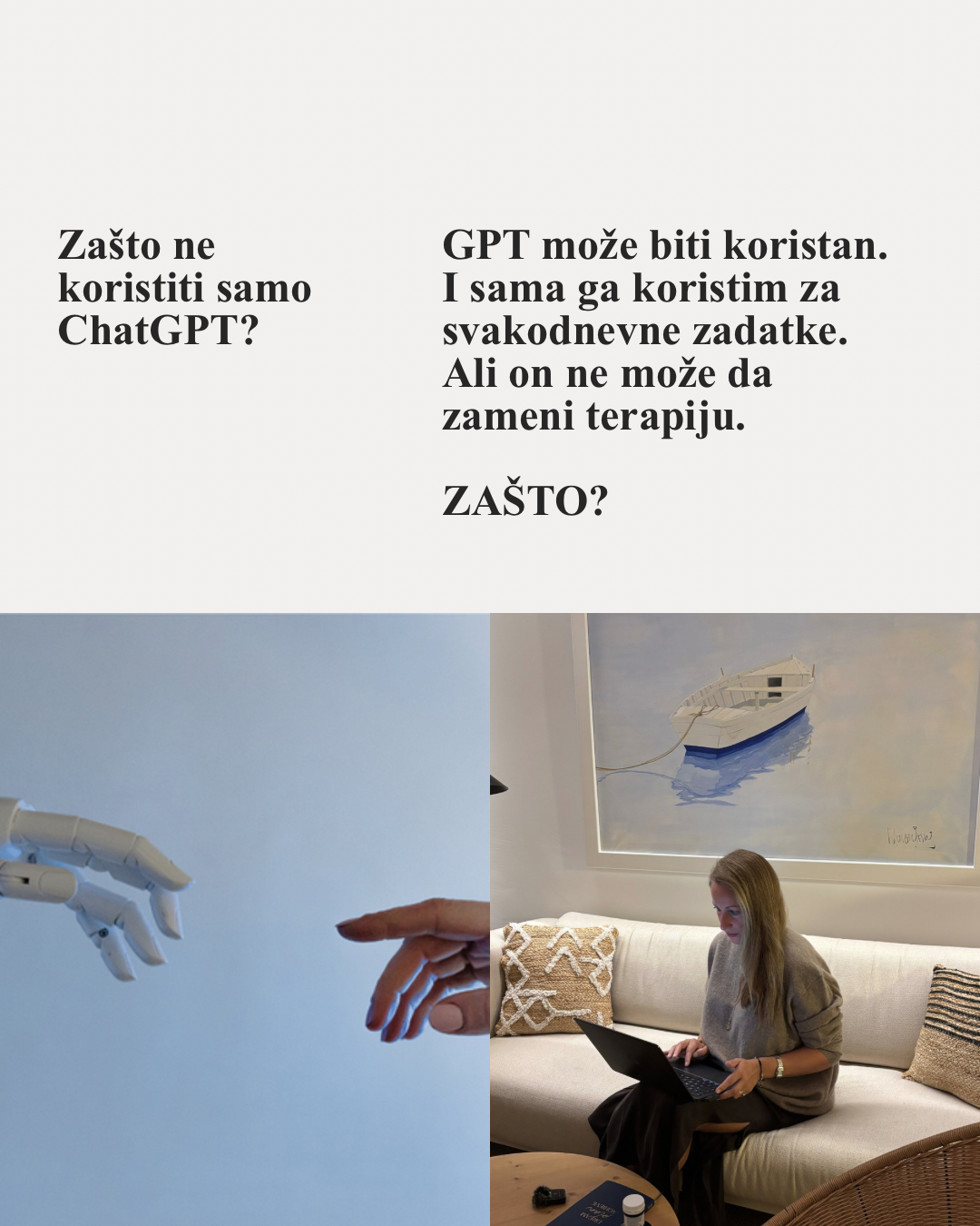 • Odgovori su reflektivni, terapijski strukturirani i prilagođeni tebi